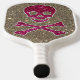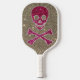 Warning, this flashy pickleball paddle will make you a better player. The design features a pink faux glitter skull and crossbones on a gold background.