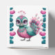 A vibrant and whimsical bird with a combination of fluffy turquoise and pink feathers. It possesses large, expressive eyes adorned with shimmering jewels in shades of pink and turquoise. The bird's head is decorated with a crown-like structure made of pink flowers and jewels. The tail feathers are a striking shade of turquoise with teal gem-like patterns. The bird stands upright, with its feet positioned on the ground, and its wings slightly tucked behind.