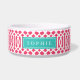 Cute customised cat or dog food bowl with a pink trellis pattern and rectangle frame placeholder for your beloved pet's name.