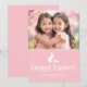Destei's pastel pink Easter card template featuring a bunny silhouette and two Easter eggs in white color. The top half is a photo template for a custom family photo and the bottom displays a “Happy Easter!” message with space for a family name and year. Perfect for creating a cute, personalized Easter greeting. The other side of the card is blush pink.