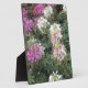 Beautiful pink and white Cleome, or Spider Flower blooms against a mellow stone wall.