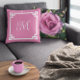 Pink and White Monogram Greek Key Border Photo Cushion