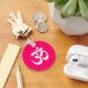 Simple white om symbol against a bright pink background.