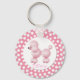 Cute pink poodle key chain done in pink with white polka dots. A white circle, in the middle, has adorable graphics of a fluffy pink poodle, and pink custom text. Personalise the text to read what ever you want. Makes a great gift idea.