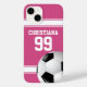 Perfect for the soccer fan or soccer player whose team colours are pink and white, with a soccer jersey style design in pink with white stripes and customisable text for their name and number. A soccer ball is also featured as part of the design. A fun, sporty and girly soccer gift.