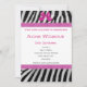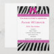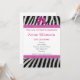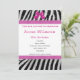 This fun invitation features black and white zebra print at the top and bottom. A graphic of a pink ribbon runs along the zebra print. A pink bow hangs from the top.