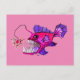 colourful artwork of a pink and purple coloured anglerfish with big teeth swimming around on a pink coloured postcard.