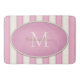 This custom bath mat has a pale ivory monogram in an oval frame on a background of broad stripes in rose pink and antique white.