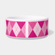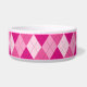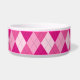 Argyle style pattern in pink colour scheme. There is also a black dog bone shaped banner with a personalizable text area for pet's name.