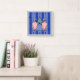 This classic Art Deco Cat Clock design is given new life by digital artist, Leslie Sigal Javorek. Set on a striped (royal blue, cornflower & silver) background having the look of fine leather, is a central medallion featuring a pair of pink Egyptian geometric cats flanking a towering Blue Pyramid that mimics the look of Bakelite (an early plastic).