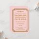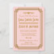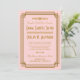 These wedding invitations feature a pink and gold colour palette, a geometric frame, and other stylistic details all inspired by Art Deco and the roaring twenties. You can customise the sample text fields to your liking.