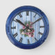 A navy blue ship portal frame on pale blue wood wall clock with pink graphic flowers to match the wedding theme