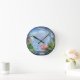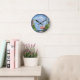 Pink Arty Flowers on Blue-wood texture Round Clock