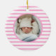 Elegant, modern and cute baby photo Christmas ornament on pink stripe pattern. This template featuring an adorable illustration of Pink baby dinosaur sleeping under the gold yellow stars with custom Baby's name. Reverse to reveal a lovely baby photo in red stripe circle frame. Great for both baby boy and girl. Perfect gift for all seasons!