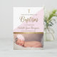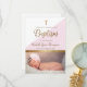 Personalise with your baby girl's photo and full name. This elegant Christening thank you card flat card makes it easier to send out your gratitude. The printed gold "Christening" script and cross adds a touch of elegance to this modern design. The pink can be changed using the customise further tool if you need, contact us at info@lddesignloft.com should you need assistance with this design.