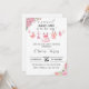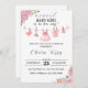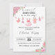 This baby shower invitation features a charming pink theme with baby girl clothes, like a dress, and shoes, hanging on a clothesline. The corners are adorned with delicate floral arrangements in pink and green, adding a soft, elegant touch to the design, perfect for welcoming a baby girl.