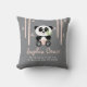 A cute and sweet personalised baby birth announcement pillow with a baby panda bear in diapers held together with a diaper pin holding a green bamboo shoot in her hand. She sits happily in the middle of a pink bamboo forest on a grey background. Customise it to say whatever you want - baby's name, date of birth, time of birth, weight and height. Artwork © Chrissy H. Studios, LLC. All Rights Reserved.
