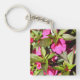 Bright pink begonia and dark green shiny leaves. Attractive key ring design.