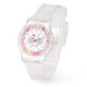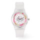 A watch featuring an illustration of a pink bike.  Personalise with your name.  Background is patchwork inspired design which incorporates gingham, polka dot, chevron zigzag, stripes, paisley, and floral patterns.