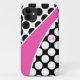Personalise your iPhone with your own initials. Bold fun graphic polkadot pattern in classic sophisticated black and white dots with hot pink curved swoosh accent from iPhone uPhone.