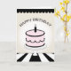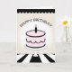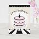 A birthday card featuring a light pink and black colour scheme. Illustration of pink and black birthday cake with one candle on a cake stand at centre. Black stripes on bottom, black and white scalloped edges design on top. Text reads "Happy Birthday." Personalise the inside.