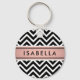 Accessorize your keys in style with a chic modern round keychain. Design features a black and white chevron zig-zag pattern, pretty pink faux rose gold foil stripe, and your name or other customized text in a simple black typography font. This elegant and trendy accessory makes a stylish gift for her. Perfect as a bridal shower or bachelorette party favor, or as a bridesmaid gift idea.