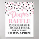 Diaper raffle sign for baby shower in a black and pink confetti pattern.