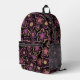 Pink Black Flower Hand-Drawn Pattern Floral Printed Backpack. Hand-drawn pink flowers on a black background.