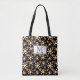 Pink Black Flower Pattern Monogram Floral Tote Bag. A modern personalised and monogrammed tote bag with a flower pattern. The flowers are pink and yellow on a black background.