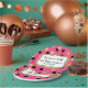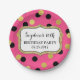 Customisable name birthday party plates in hot pink fuchsia with black and gold confetti pattern, please note gold is photographic effect only.