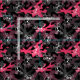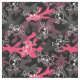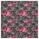 Girly and cool camouflage fabric in fields of pink, charcoal, and black and a pattern of skull outlines in white.