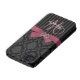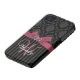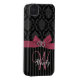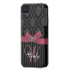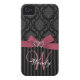 This monogrammed black and grey damask iPhone 4 Case-Mate Case has a photo of this design embedded into the hard plastic cover. The design is made up of a black and grey floral damask pattern, a printed pink bow and ribbon, two hearts with diamonds and a black and grey striped pattern bottom portion where you can add your name and monogram initial in gorgeous script fonts. This iPhone 4 case cover is the perfect way to accessorise your iPhone 4. Be stylish and girly all at the same time. Design by Elke Clarke©2012. Graphics licensed for use.