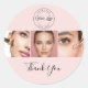 Blush Pink Photo Makeup Artist Thank You Sticker. This elegant round sticker features your custom logo at the top, three photo placeholders for showcasing your work or brand imagery, and a handwritten-style “Thank You” message below. The soft blush pink background complements the modern, feminine aesthetic, and the design can be fully personalised to match your brand. Ideal for sealing packages, adding a professional touch to client gifts, or elevating your post-appointment thank-yous with style.