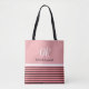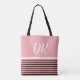 A stylish, modern and monogrammed pink tote bag with black horizontal stripes, personalised with her name and initials (handwritten font style)