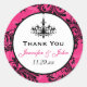 This 1.5" round hot pink, black and white chandelier wedding favour thank you sticker and/or envelope seal matches the wedding invitation shown below. You can change the text to say whatever you want, and you can also change the sticker size to 3" and adorn your wedding or party favours with, or use them to seal your candy buffet bags or boxes. If you require any other matching items in this design, please email your request to niteowlstudio@gmail.com.