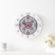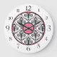 Elegant round wall clock with a black & white damask pattern accented with pink. The numbers are in a fancy size varying pattern to break up the typically uniformity that most clocks display.