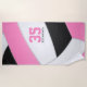 This cute volleyball themed beach towel features an abstractly oversized pink, black and white volleyball that covers the entire towel - her name and jersey number are positioned off centre, customisable in coordinating pink and black - by katz_d_zynes