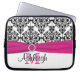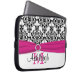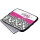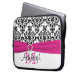 This personalised white, black and hot pink damask laptop sleeve with a FAUX ribbon and jewel brooch has text boxes for you to customise with your own name, monograms, business name, or other text. If you need any help customising, please email niteowlstudio@gmail.com.