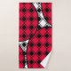 This towel set has a black washcloth, a pink hand towel, and a bath towel with a mid-century modern design of solid black diamonds inside black diamond outlines with pink blobs under them, all on a field of white.