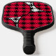 This pickleball paddle has a mid-century modern design of solid black diamonds inside black diamond outlines with pink blobs under them, all on a field of white.