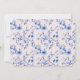 This tea party invitation has a chinoiserie design featuring a blue and white tea party with bamboo furniture on a pink background. The arched border has a blue floral branch pattern on a blush pink background. The front and back have a coordinating pattern.