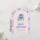 This tea party invitation has a chinoiserie design featuring a blue and white pagoda on a pink background. The arched border has a blue floral branch pattern on a blush pink background. The back has a large pagoda.