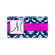 Blue White Damask Return Address Labels with fuchsia hot pink accent colour are fully customisable with your monogram initial and name and return address. Perfect for all your letter correspondence or on a special invitation like a wedding invitations or Wedding RSVP Card Envelopes. Elke Clarke©