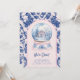 This Change of address party invitation has a preppy grandmillennial design featuring a Gingerbread House in a snow globe with a blue and blush pink arched border around the edge. The front and back have a coordinating damask pattern.