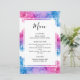 A baby gender reveal party food menu. On a white background the design consists of erupting elegant blue and pink smoke. Within a white outlined box, the text includes the starter, main course and dessert food menu. On the back, the baby's surname is shown within falling blue and pink smoke, followed by gender reveal, the date of the event, or baby due date, and the name of the couple.