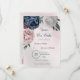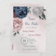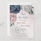 Beautiful botanical save the date card featuring pink, white and navy blue flowers with green leaves.