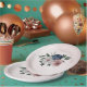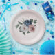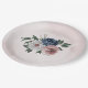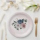 Beautiful botanical wedding paper plate featuring romantic pink, white and navy blue flowers with green leaves.