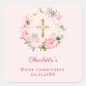 A soft blush pink background, decorated with watercolored pink and ivory flowers in a wreath and a golden cross. Personalize and add the name and date.