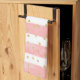 A kitchen towel with an elegant pattern. Featuring pink blush coloured horizontal stripes and faux gold confetti glitter scattered around.