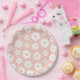 Add a finishing touch to your baby shower with these paper plates, featuring a pattern of daisies on a pink background.